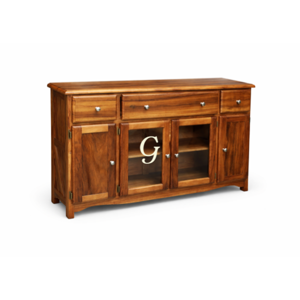 Fabricado en cenizaro sólido, una madera reconocida por su dureza, estabilidad y hermosa veta marcada, este mueble resalta por su acabado fino que realza cada detalle natural de la madera. Su diseño combina puertas sólidas laterales con puertas centrales en vidrio, permitiendo exhibir vajilla, cristalería o elementos decorativos con elegancia.